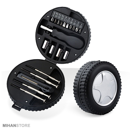 جعبه ابزار طرح تایر، محصولی با طراحی کاملاً جدید و در عین حال فانتزی است. این جعبه ابزار همه کاره، به سادگی می تواند در هر شرایطی همراه شما باشد تا در صورت نیاز بتوانید از آن استفاده نمایید. جعبه ابزار طرح تایر ، دارای 20 قطعه می باشد که شامل کاتر ، آچار بکس و انواع پیچ گوشتی می شود و قابل استفاده در منزل ، محل کار ، درون خودرو و ... خواهد بود. ظاهر این جعبه ابزار مشابه یک تایر خودرو است و به همین دلیل به این عنوان نامیده می شود.