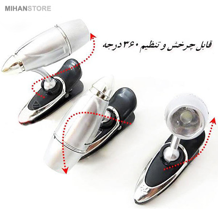 چراغ کلیپسی جیبی، محصولی با طراحی جدید و بسیار کاربردی برای همه افراد در شرایط مختلف است. این چراغ قوه شامل یک چراغ ال ای دی با نور مناسب جهت روشن کردن سطح می باشد که با استفاده از سه عدد باطری ساعت تغذیه می شود. چراغ بر روی پایه با قابلیت چرخش 360 درجه و تنظیم زاویه تابش قرار گرفته که با استفاده از آن به سادگی می توانید نور مورد نیاز را در موقعیت مناسب تنظیم و ثابت کنید . پایه چراغ قوه مطالعه ، مجهز به گیره کلیپسی شکل می باشد که با وجود آن می توانید چراغ را بر روی لبه کتاب ، جزوه و سایر سطوح... قرار دهید تا نور مورد نیاز شما را تأمین نماید، علاوه بر این از چراغ کلیپسی جیبی، می توان برای روشن کردن صفحه کلید لپ تاپ نیز استفاده نمود، کافیست بر روی لبه نمایشگر نصب و زاویه آن را روی صفحه کلید تنظیم نمایید . ابعاد مناسب ، وزن کم ، نور کافی ، امکان نصب آسان بر روی لبه کتاب ، نمایشگر و ... ، همگی ویژگی هایی هستند که چراغ قوه کلیپسی را به یک ابزار کاربردی با امکان حمل و جابه جایی آسان جهت دسترسی در شرایط مختلف تبدیل نموده است .