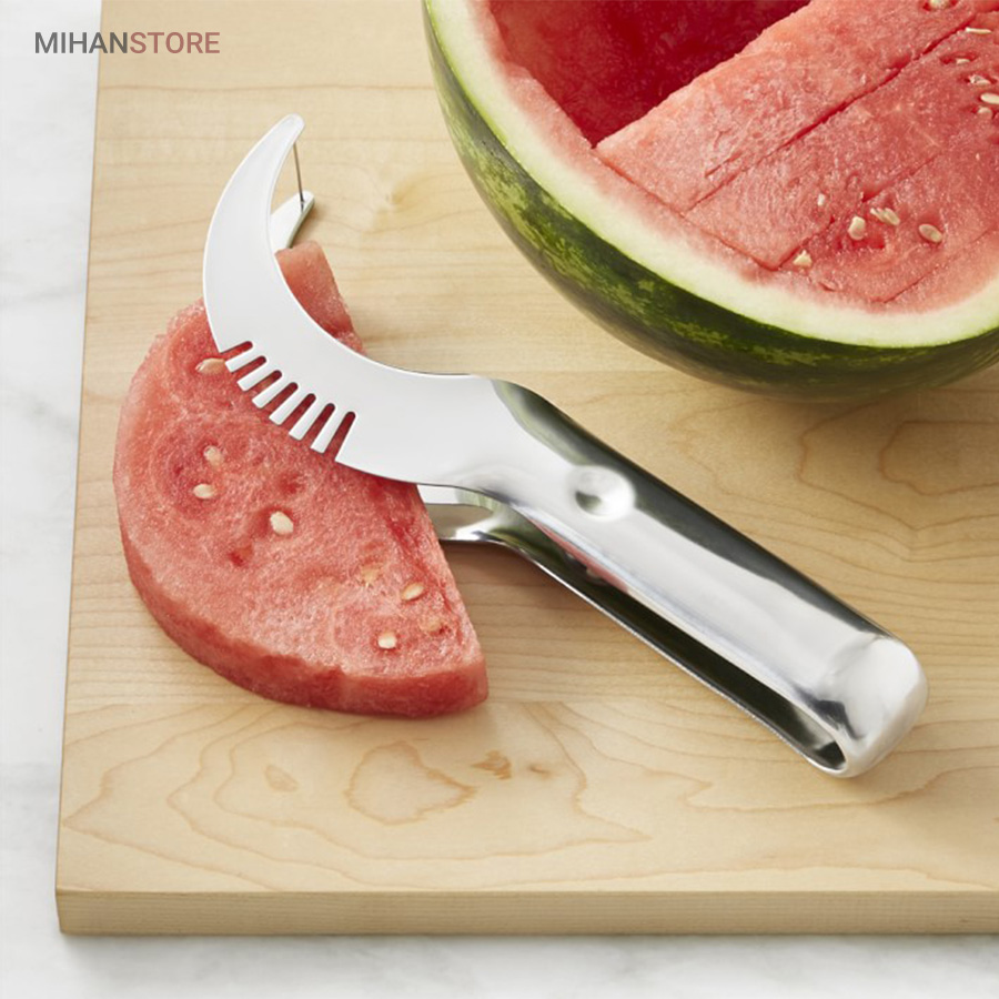 شکل ظاهری این اسلایسر شبیه به داس بوده و مانند یک انبر کنار همدیگر قرار گیرفته و همانطور که اشاره شد در انتهای آن یک تکه فلز یا تیغه به هم متصل شده تا در حین برش کاملا یک دست و یک شکل شود.  از این اسلایسر هندوانه می توانید در سفر هم استفاده کنید. ابعاد در نظر گرفته شده برای برش زن هندوانه 25 × 5 سانتی متر است.  وزن سبک، شست و شوی راحت و آسان از دیگر مزیت های این لوازم آشپزخانه کاربردی محسوب می شود.