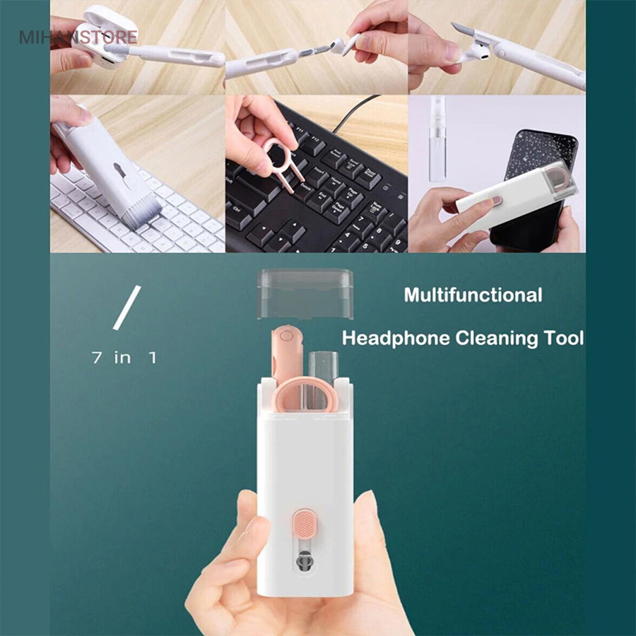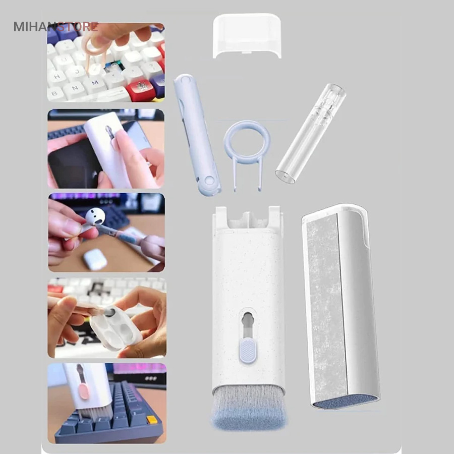 این کیت تمیزکننده 7 کاره شامل 1 برس بزرگ با تراکم بالا، 1 عدد پد تمیز کننده فیبری (مخصوص سطوح مانند مانیتور) ، 1 قلم تمیز کننده گوشی (شامل نوک فلزی، اسفنج و مینی برس با چگالی بالا)، 1 عدد کلیدکش کیبورد و 1 بطری اسپری می باشد. این سرویس پاک کننده چند منظوره می تواند هر خواسته شما را برای تمیز کردن وسایل الکترونیکی برآورده کند. اولین ابزار یک خودکار تمیزکننده تاشو با نوک سیلیکونی، برس کوچک سخت و اسفنج جمع‌کننده کثیفی ها ، مناسب برای تمیز کردن ایرپاد و سایر هدفون‌ها یا هندزفری ها. نوک سیلیکونی برای تمیز کردن لکه های شکاف است. دومین ابزار برس کوچک برای تمیز کردن گرد و غبار سطوح عمیق و اسفنج دسته دار برای تمیز کردن حفره های کیس شارژ  ایرپاد ها می‌باشد. ابزار سوم تمیز کننده لپ تاپ، رایانه، تبلت و صفحه کلید می باشد کافیست برس نرم بزرگ را بکشید تا گرد و غبار روی رایانه، لپ تاپ، تبلت و صفحه کلید پاک شود. و همچنین می توانید از کلیدکش کیبورد جدا کردن کلیدهای صفحه کلید مکانیکی برای انجام این کار استفاده کنید. ابزار بعدی تمیز کننده مانیتور، صفحه نمایش، دوربین، ساعت و تلویزیون میباشد: در کنار یک بطری خالی اسپری 5 میلی‌لیتری، مایع تمیزکننده یا آب را درون بطری قرار می‌دهید و از صفحه فیبری برای تمیز کردن صفحه‌های مختلف استفاده می‌کنید. به عنوان مثال صفحات نمایش ، تلویزیون، ساعت، دوربین و غیره.اندازه جمع و جور و سبک وزن: 7 ابزار تمیز کردن کامپیوتر به طور مرتب در یک جعبه مستطیلی قرار گرفته اند. اندازه کیت پاک کننده فقط 4.88 * 1.73 * 1.18 اینچ و وزن آن تقریبا 80 گرم است. برای سفر به اندازه کافی کوچک است و می توانید آن را حمل کنید. در همین حال، شما همچنین می توانید هر ابزار تمیز کننده ای را به طور جداگانه بیرون بیاورید.