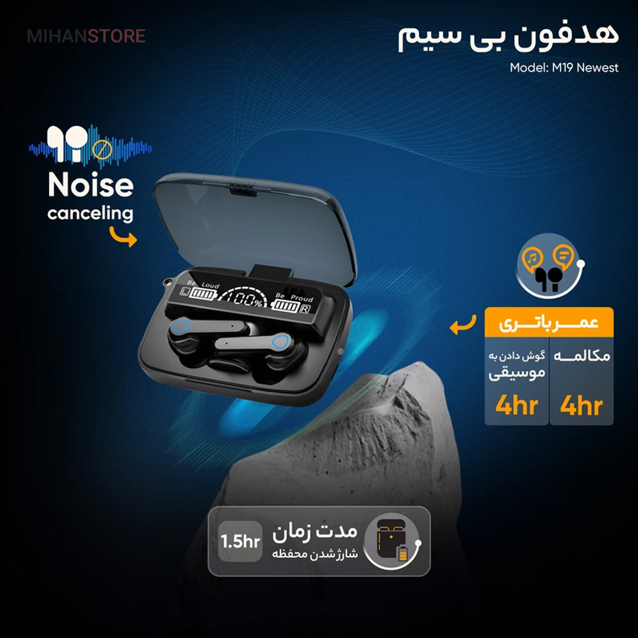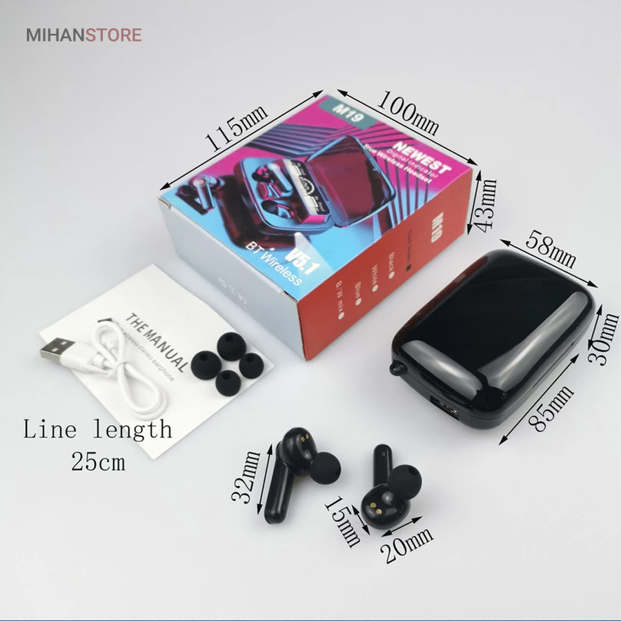 اگر به دنبال هندزفری بی‌سیم جمع‌و‌جور هستید، هندزفری بلوتوثی مدل M19 Newest یکی از گزینه‌هایتان است. این مدل برخلاف ایرپاد به‌صورت کامل در گوشتان قرار می‌گیرد. این محصول دارای محفظه با ابعاد استانداردی است و به‌آسانی در جیب و کیفتان جای می‌گیرد. محفظه شارژ مجهز به باتری قدرتمند 1600mAh است که تا ساعت ها میتوانید از آن استفاده کنید یا به عنوان پاوربانک برای شارژ گوشی بهره ببرید. همچنین این محفظه دارای نشانگر LED زیبا برای نمایش میزان شارژ محفظه و هریک از گوشی هاست. اتصال این هندزفری به گوشی از طریق بلوتوث امکان‌پذیر است. برای این محصول بلوتوث نسخه 5 تعبیه‌شده تا برقراری ارتباط کیفیت بالایی داشته باشد.فاصله اتصال 10 متری ، عملکرد پایدار ، انتقال زیاد ، مصرف کم و سازگاری قوی را به شما اراءه میدهد. اگر قصد دارید از این مدل بدون محفظه استفاده کنید، تا 4 ساعت این محصول قابلیت پخش موسیقی را به شما می‌دهد. در صورت استفاده از محفظه شارژ این میزان تا 12 ساعت افزایش می‌یابد. زمان مکالمه 4 الی 6 ساعت و زمان شارژ محفظه 1.5 ساعت می باشد. این هندزفری دارای استاندارد IPX-7 بالاترین سطح ضد آب بودن است. استفاده از فناوری کاهش صدای دیجیتال.از لحاظ ارگونومیک با طراحی خوب براحتی در گوش قرار میگیرد.