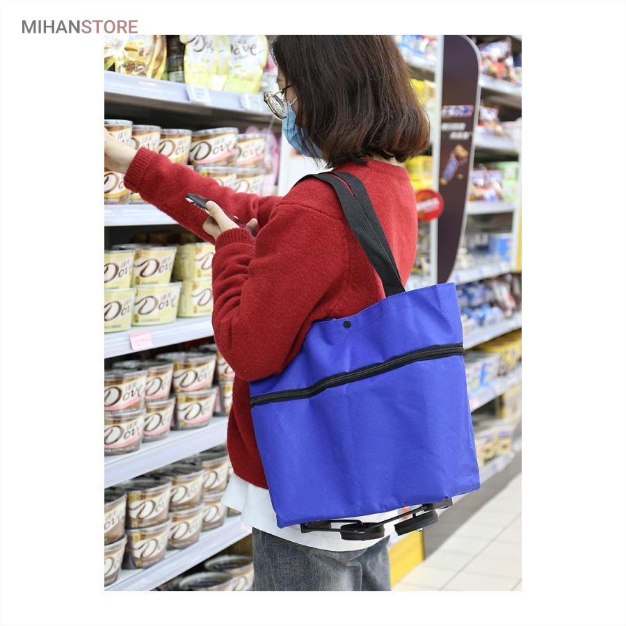 کیف خرید چرخدار تاشو دارای چرخ‌هایی است که به شما کمک می‌کند بدون اینکه وزن خریدتان را بر روی شانه‌ها یا دست‌های خود احساس کنید، خریدتان را به‌راحتی حمل کنید. برای استفاده از ساک خرید در حالت چرخدار، کمی تایرها را به سمت عقب کشیده تا از محل خود خارج شوند و در حالت چرخدار از ساک خرید استفاده کنید.