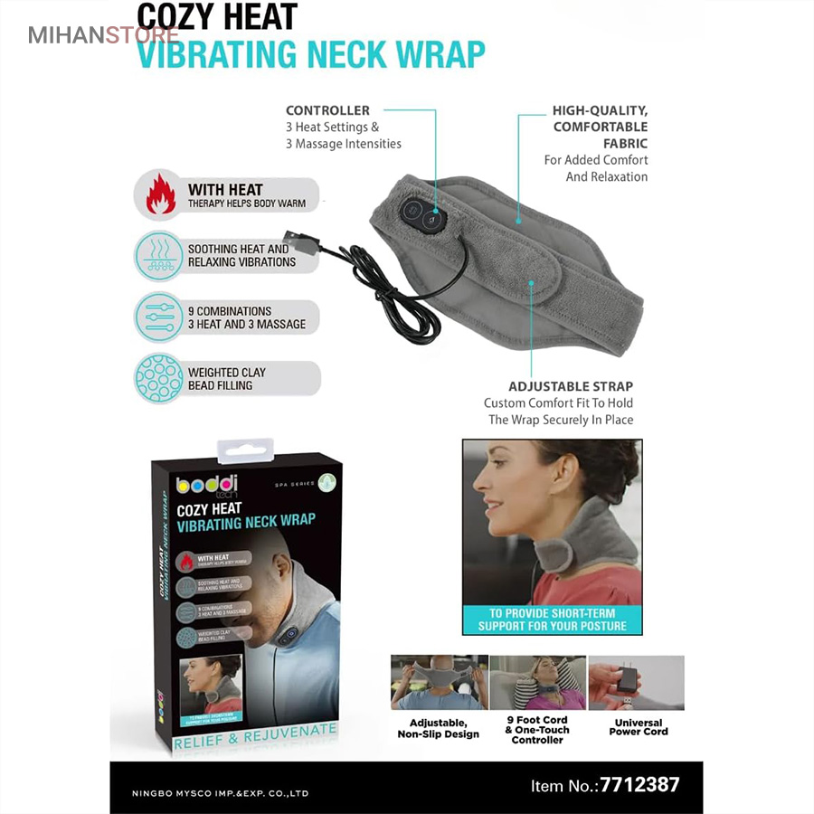 ماساژور و پد حرارتی برقی گردن با هدف تسکین درد و کمک به بهبود دردهای ناحیه گردن کمک میکند و به صورت حوله ای بسیار نرم بر روی ناحیه گردن بسته میشود. گرمای تسکین دهنده و ارتعاشات آرامش بخش سنگ های معدنی همراه با تنظیم گرما و ارتعاشات ماساژ با کیفیت بالا از قابلیت های این ماساژور میباشد همچنین پوشش پارچه ای 100% پلی استر و دانه های پرکننده 77% دانه های سفالی ، ‌23% نمد الیاف پلی استر و دارای بند قابل تنظیم میباشد.