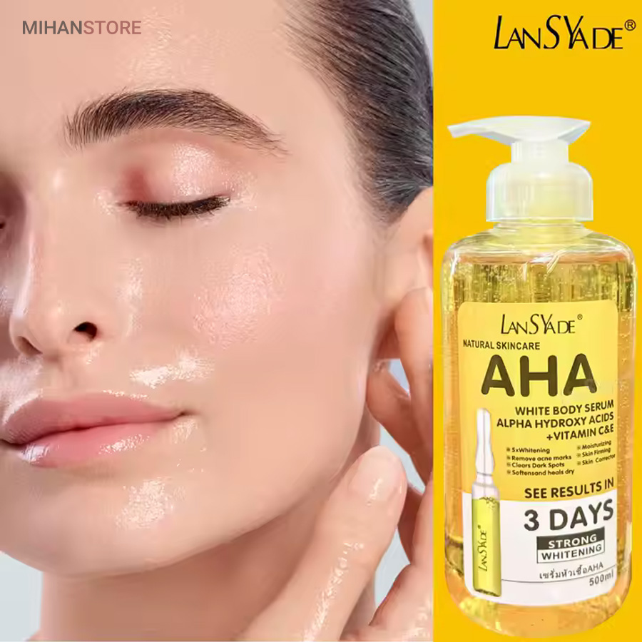 سرم روشن کننده بدن aha به تدریج آثار باقیمانده از آکنه و لکهها را محو کرده و پوست را صافتر نشان میدهد.