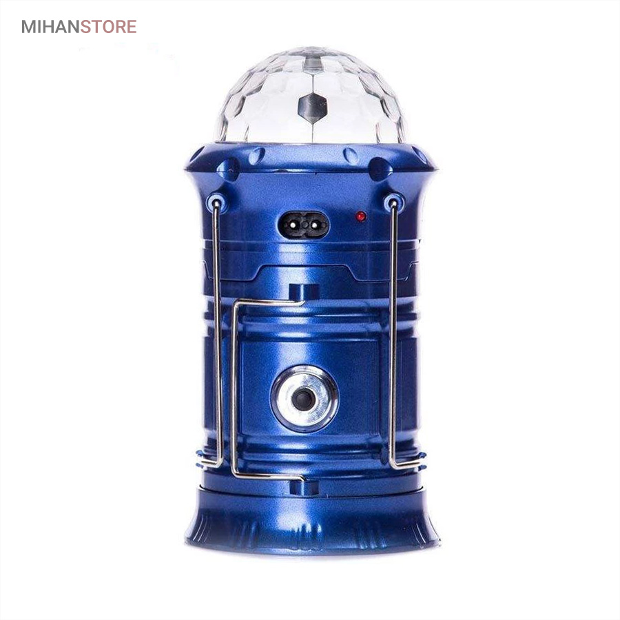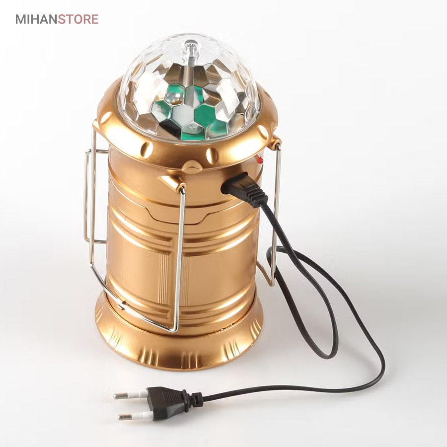 چراغ کمپینگ شارژی رقص نور دار قابل حمل به همراه رقص نور، محصولی با طراحی نوین و بسیار کاربردی است ‏.‏ این چراغ را می‌توان تلفیقی از فانوس های قدیمی و چراغ قوه های جدید و رقص نور مدرن دانست .‏چراغ کمپینگ شارژی رقص نور دار، در واقع یک ابزار چند کاره است و می‌تواند به سادگی نیاز های شما در رابطه با نور را در مسافرت، پیک نیک و جشن های خانواگی و مواردی نظیر آن فراهم کند .‏ شما می‌توانید با کشیدن سر چراغ به سمت بالا ‏(‏کشویی‏)‏، فانوس را روشن کنید و از آن برای تأمین نور محیط استفاده نمایید‏.‏ چراغ اصلی فانوس دارای 6 چراغ ال ای دی است که در کنار هم نور قوه ای را ایجاد می‌کنید‏.‏ همچنین در بالای این فانوس یک شیشه منشوری وجود دارد که هنگام روشن کردن با چرخش و نور پردازی فضای دل انگیزی را برای شما به وجود می‌آورد‏.‏ این محصول خرید خوبی برای استفاده در کمپینگ و طبیعت‌گردی خواهد بود.ورودی برق روی دستگاه بوسیله سیم همراه به برق وصل شده و چراغ را شارژ می‌نماید تا بتوانید به صورت بی سیم از چراغ استفاده نمایید.خروجی یو اس بی روی دستگاه نیز برای شارژ تلفن همراه شما تعبیه شده است و برای شارژ کردن گوشی موبایلتان است.جنس بدنه‌ی این محصول سبک و کم حجم، جنس بدنه از ABS + PC، محکم و بادوام است که به‌سادگی آسیب نمی‌بیند و این امکان را به شما می‌دهد تا مدت‌زمان زیادی به‌صورت مستمر از آن استفاده کنید. این محصول وزن قابل‌قبولی دارد و شما می‌توانید به‌راحتی آن را حمل کنید و در سفر‌ها به‌ همراه داشته باشید.