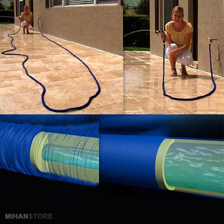 فقط کافیست تا شیر آب را باز کنید تا این شیلنگ تا سه برابر اندازه اولیه خود قد کشیده و بزرگ شود و با بستن شیر آب به اندازه اولیه خود باز گردد و به اندازه یک بسته دستمال کاغذی شود! این شیلنگ که از یک لایه قابل انعطاف ضخیم درونی و یک لایه تاشو بیرونی ساخته شده از جنس مش بافته شده ی قوی است و شبیه به هیچ شیلنگ دیگری نیست و با ساختار خارق العاده ، استفاده از آن باعث رضایت شما شده و شما میتوانید به راحتی از آن در داخل خانه و حیاط و کارواش ماشین و شتشوی شیشه ها و دیوار و باغبانی و …. استفاده کنید.