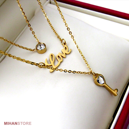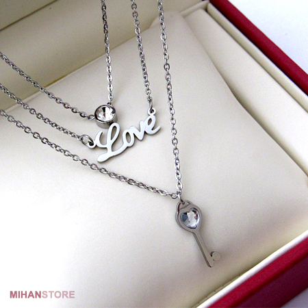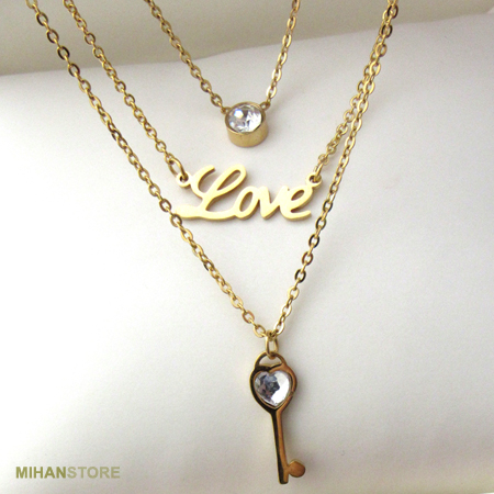 - دارای گردنبند سه زنجیره با آویز های نگین، Love و کلید